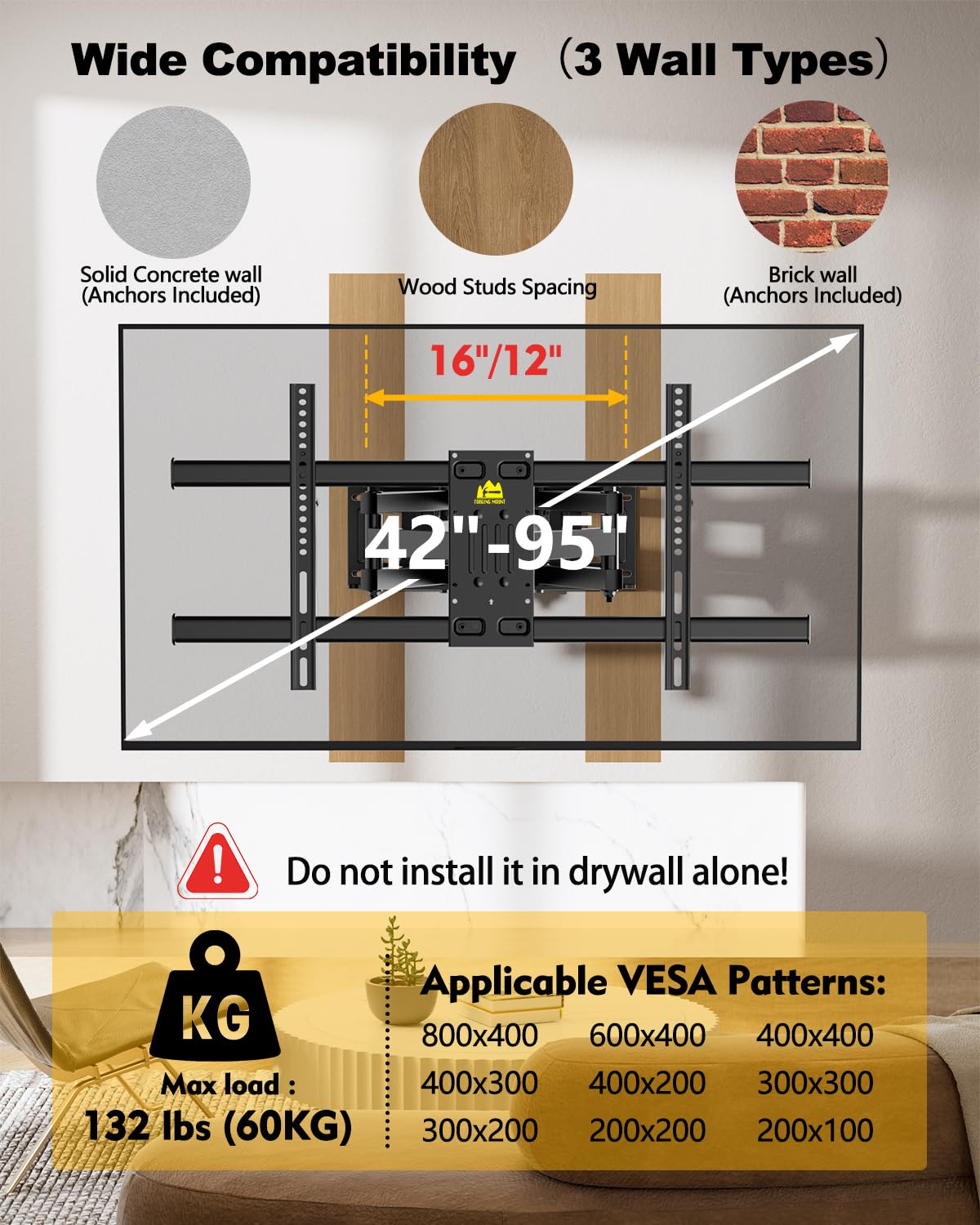 - Wide Compatibility TV wall mount : This full motion TV wall mount is designed to fit most 42″-95″ flat or curved TVs with VESA patterns 200x100 to 800x400mm. holds up to 132lbs The 85 inch TV wall mount can be installed on 12″/16″ wood studs or solid concrete walls, and brick walls. Please do not mount on drywall alone.