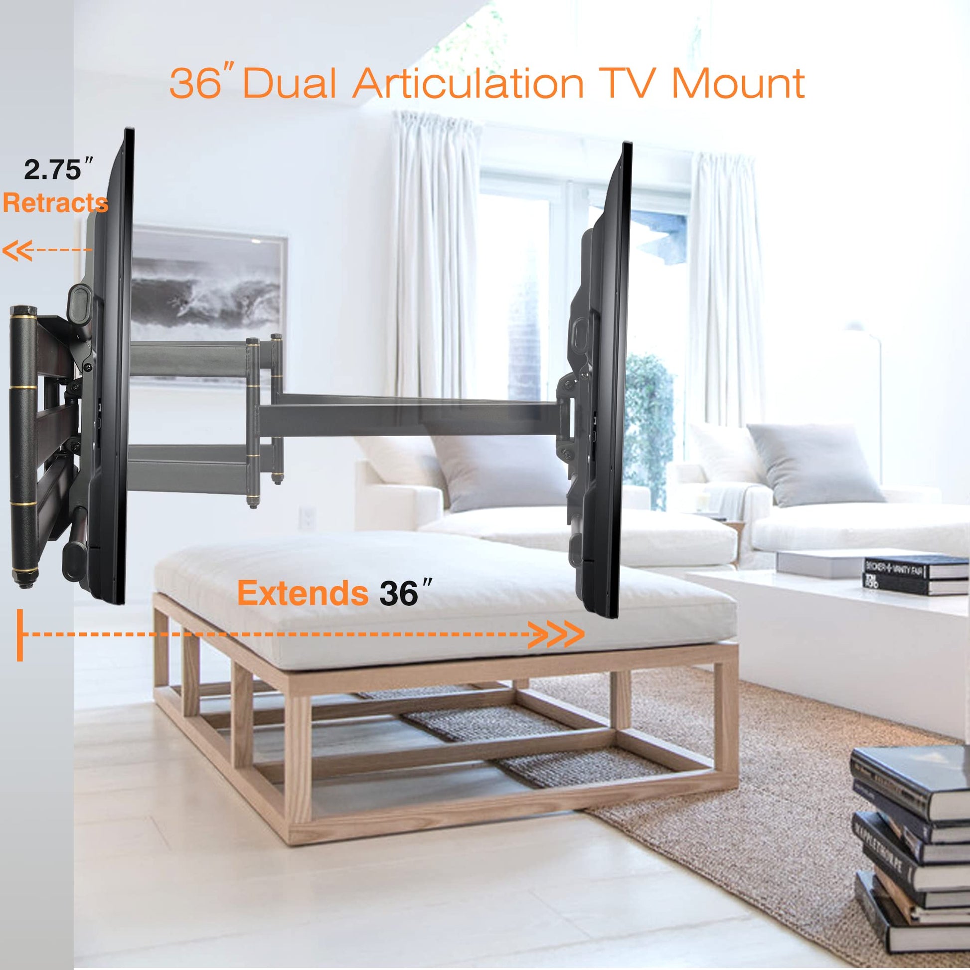 - 36 inch Extends Full-Motion TV Mount: Multiple functions and the super long 36” dual-arm extension allows you to find the perfect viewing angle in any type of space. Tilt, swivel, level and extend until you're tired of tilting, swiveling, leveling and extending. Just sit down already.