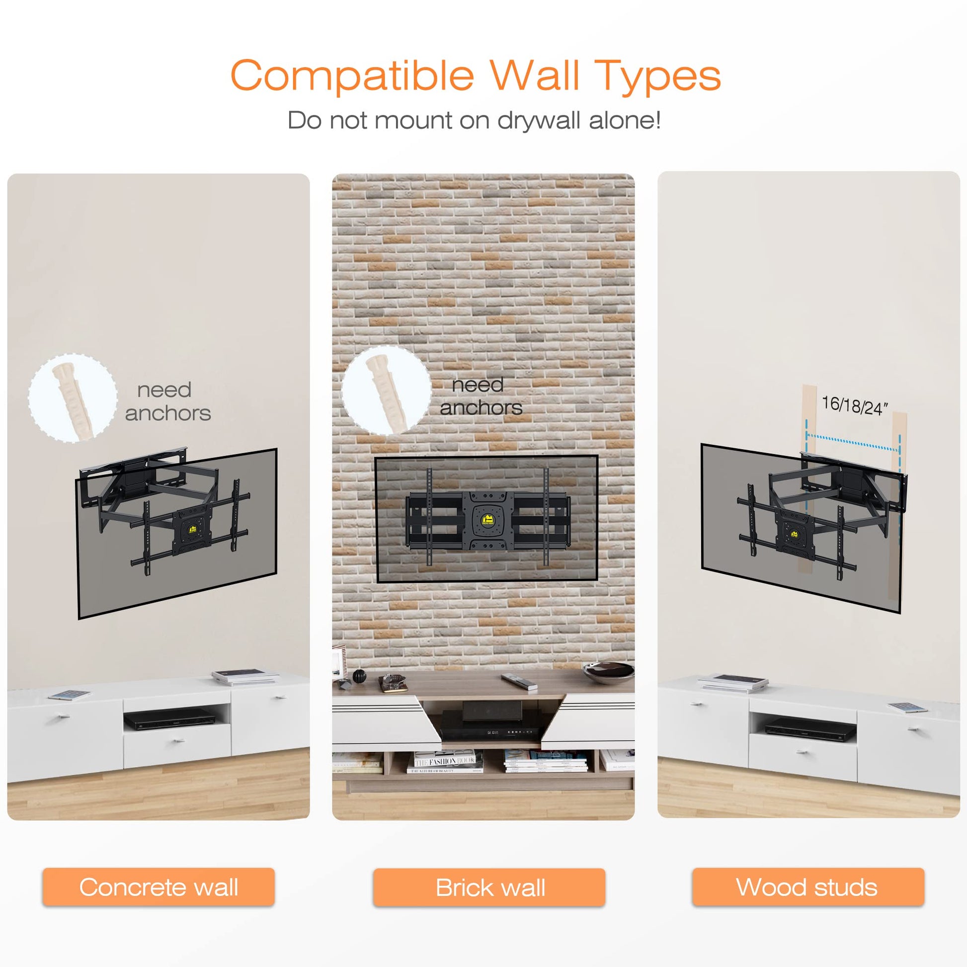 - Enormous Long Arm TV Wall Mount:Fits most 50"-95" Flat/curved LCD LED OLED TVs, Compitable 16", 18" or 24" Wood Studs, concrete wall and brick wall, VESA patterns from 100x100mm up to 600x400mm, weighing up to 198lbs.