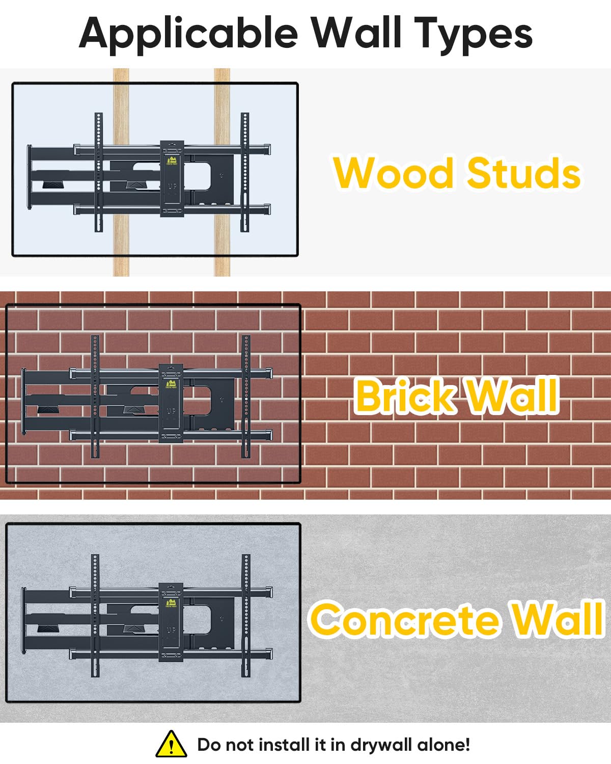 - Durable and Reliable: This Long Extension TV Mount is built with heavy-duty carbon steel construction, unsplit wallplate and arm design to support TVs up to 100 lbs, and it is passed the 330Lbs loading test.