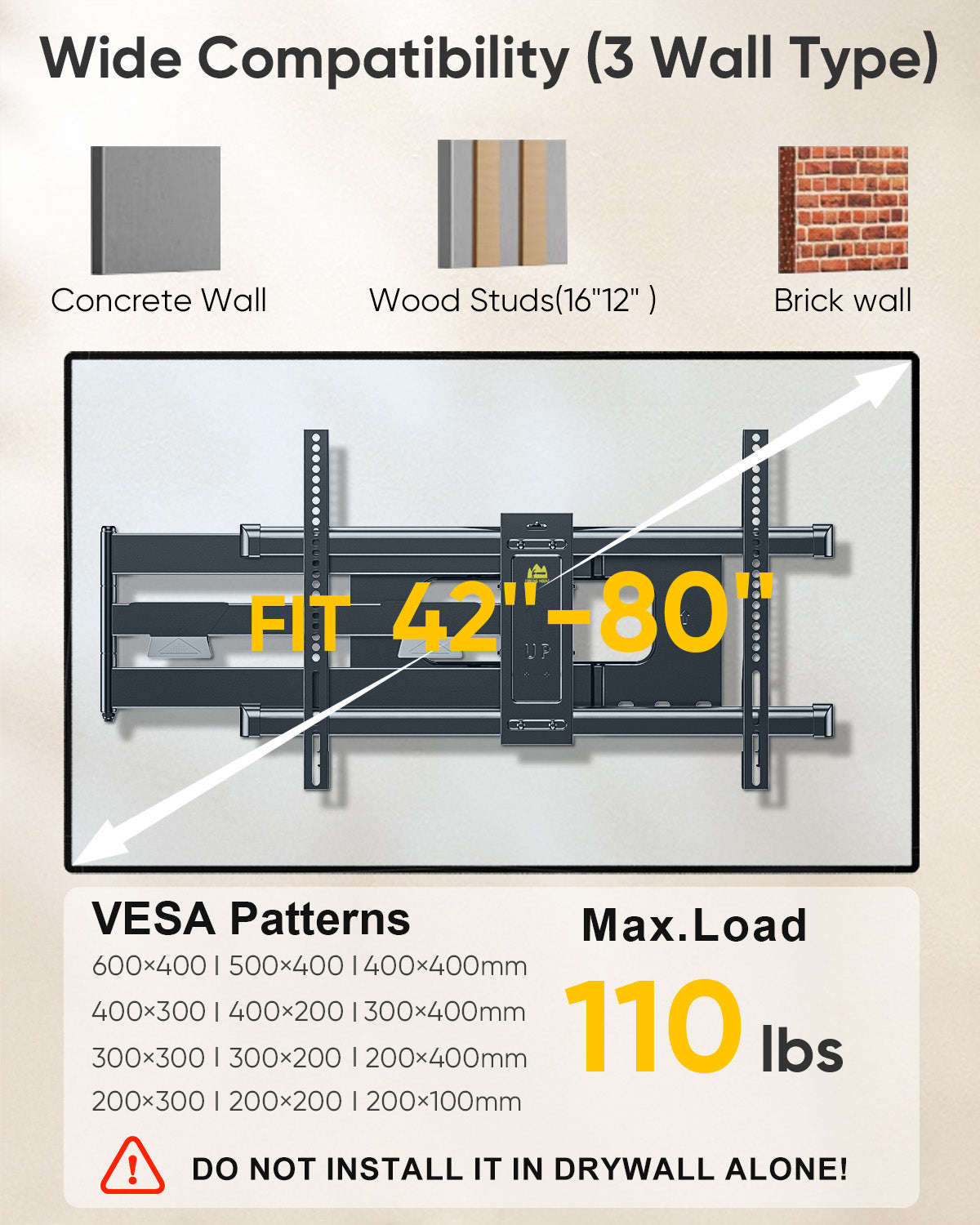 - 43 Inches Extra Long Arm TV Wall Mount: Fits most 42"-80" Flat/curve LCD LED OLED TVs , VESA patterns from 200x100mm up to 600x400mm, weighing up to 110lbs