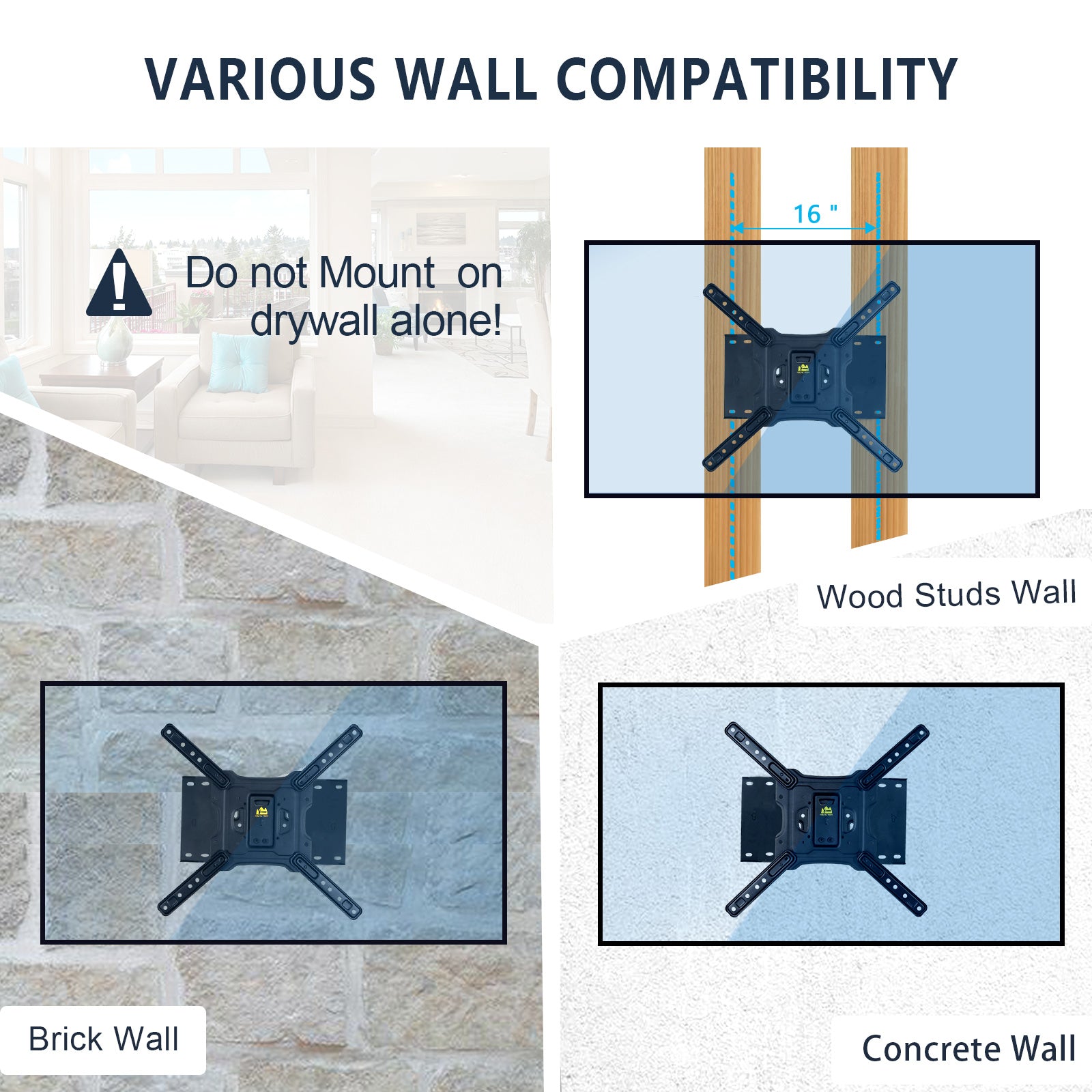 - Easy Fast Installation: This Wall Mount TV Monitor bracket comes with pre-set drill hole template and a variety of screws and is easy to follow the instruction manual to accommodate any brand of Television. This TV wall mount can be used in 16" wood stud walls and solid concrete walls.it also included 6 ft HDMI cable, 3-Axis bubble level, 3 cable ties, and our incredible 5-year warranty and friendly customer service.