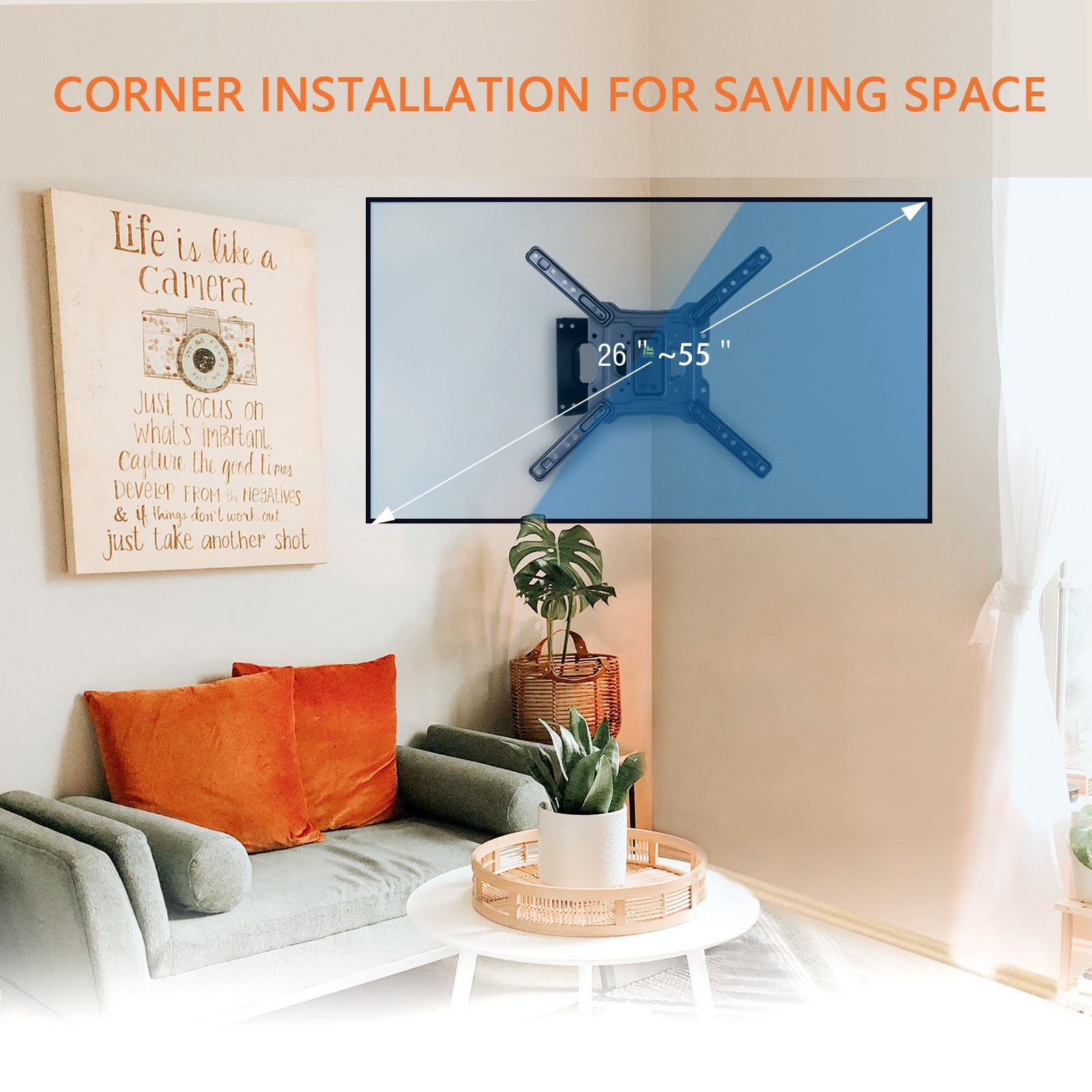 - Full Adjustment: Full motion, extends, articulates, tilts, swivels, levels and collapses on this Longarm Full Motion TV Wall Mount. Making it ideal for corner installation, over a fireplace, or inside a TV center. Low-profile design ensures TV is close to the wall for a sleek finish. Cable management is included.