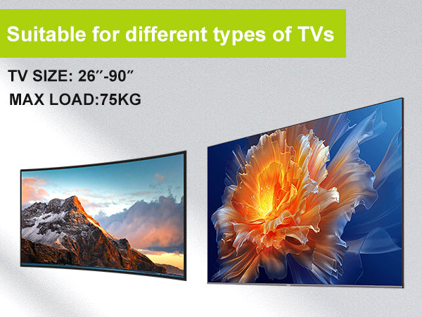 【UNIVERSAL COMPATIBILITY】This no drill wall mount is suitable for 26-90inch TVs, VESA 100x100mm to 900x600mm, comes with various screws and fits most TV and monitor models on the market.