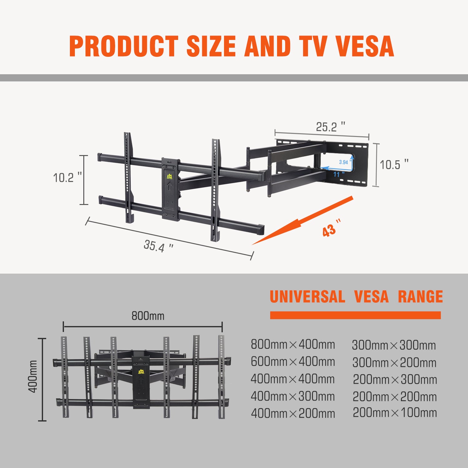 - 43 Inchs Extra Long Arm TV Wall Mount: Fits most 42"-95" Flat/curve LCD LED OLED TVs , VESA patterns from 200x100mm up to 800x400mm, weighing up to 110lbs