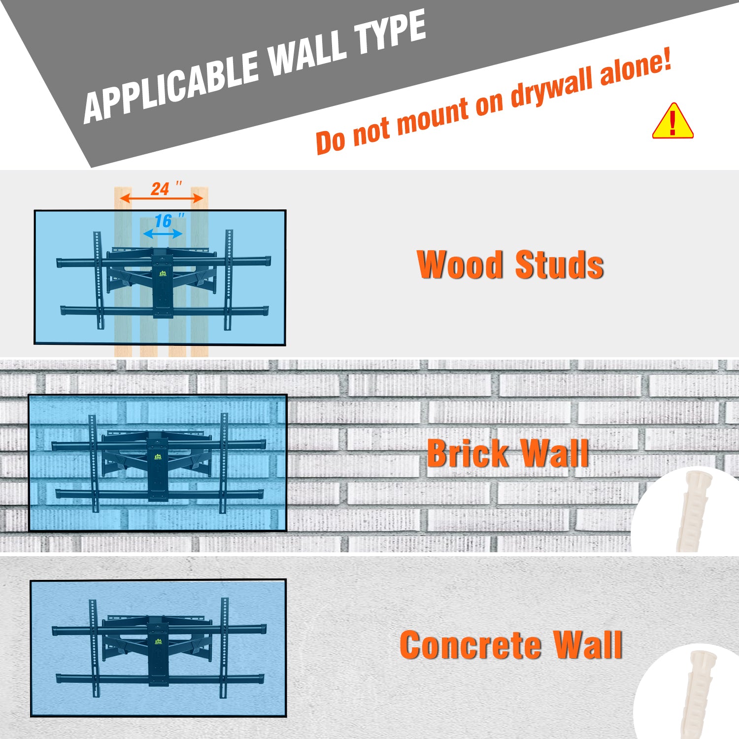 - Durable and Reliable: This Long Extension TV Mount is built with heavy-duty carbon steel construction, unsplit wallplate and arm design to support TVs up to 110 lbs, and it is passed the 330Lbs loading test.